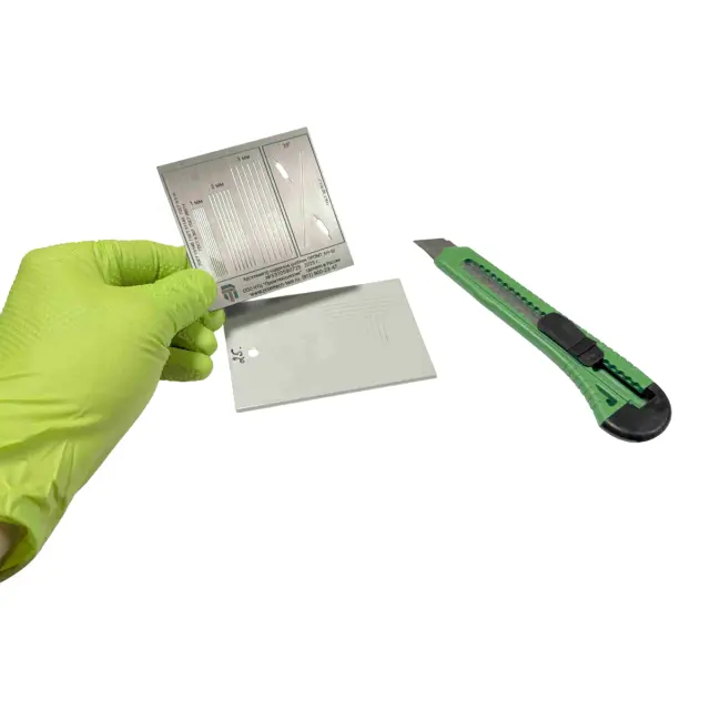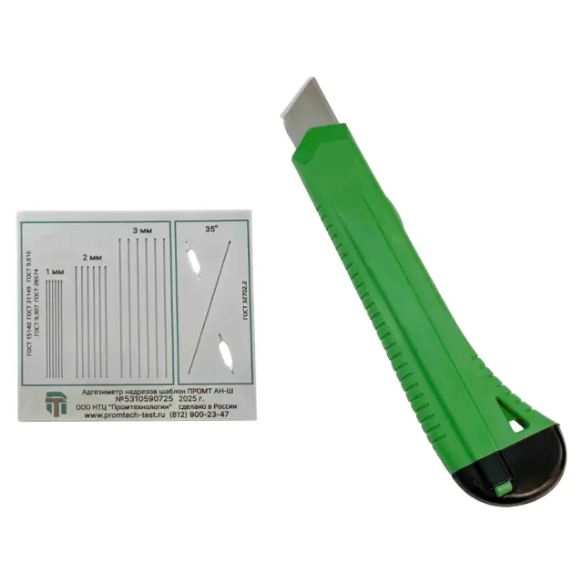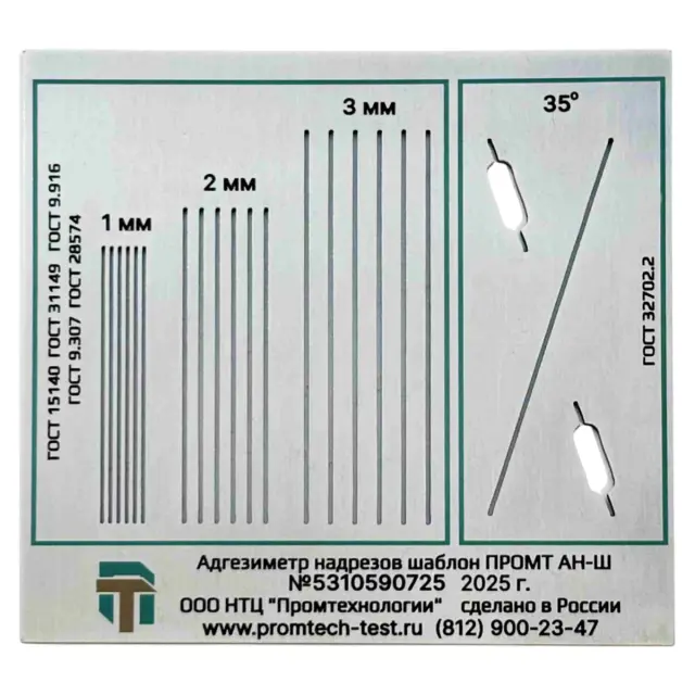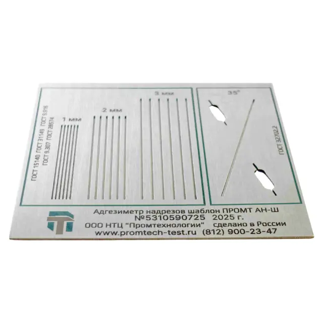 Адгезиметр надрезов шаблон ПРОМТ АН-Ш используется для контроля адгезии покрытий методом параллельных, решетчатых и Х-образного надрезов. В основу метода положено определение характера и степени разрушения покрытия после нанесения на него параллельных, решетчатых либо Х-образного надрезов. Шаг и угол надрезов выдерживается использованием одного из видов прорезей в шаблоне. Степень адгезии определяется по таблице предусмотренной используемым нормативом. Является модифицированной версией устройства NOVOTEST АР-АХ.