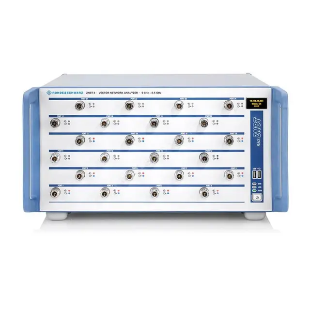 Анализатор цепей Rohde Schwarz ZNBT8 - измерительное устройство, которое имеет 4 порта для коммутации с исследуемыми приборами и может применяться как в ходе разработки, так и в процессе эксплуатации. Конструктивно от серии ZNB отличается отсутствием на фронтальной панели экрана и встроенной клавиатуры. Управлять прибором в ручном режиме, можно, подсоединив мышь, клавиатуру или внешний экран, или дистанционно по шине IEC/IEEE или LAN. Преимущество серии в оборудовании встроенным рефлектометром для обеспечения максимальной эффективности относительно скорости, мощности на выходе, чувствительности и динамического диапазона.
