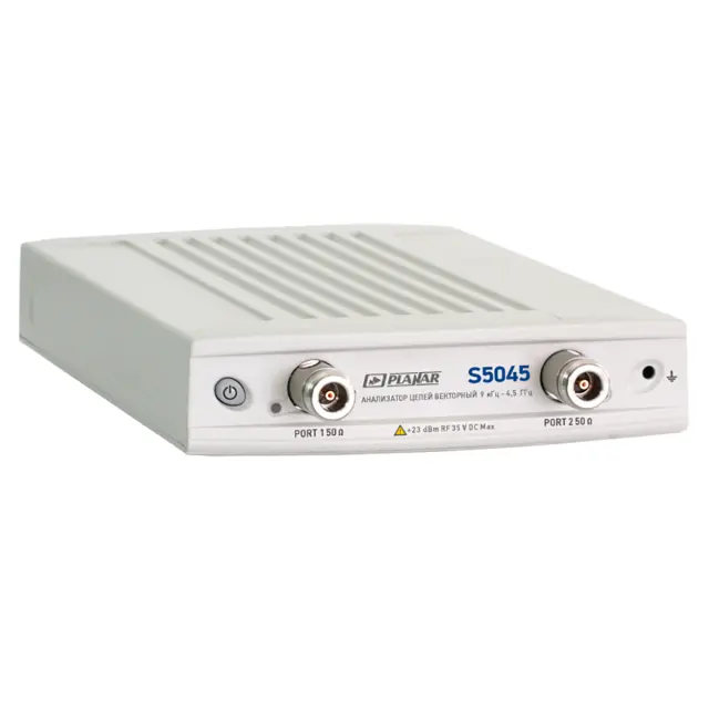 Анализатор цепей векторный Planar S5045 представляет собой компактный высокопроизводительный прибор, работающий под управлением пользовательского ПК, подключенного по USB интерфейсу, и оснащенный двумя измерительными портами. Устройство способно определять S-параметры объектов контроля с волновым сопротивлением 50 Ом в полосе частот от 9 кГц до 4,5 ГГц, с отображением результатов измерений во временной и частотной областях, и может использоваться в ходе разработки и производства радиотехнической продукции и ее компонентов. В отличие от подобного оборудования бюджетного класса, в данной модели векторного анализатора цепей предусмотрена возможность работы в составе автоматизированных стендов и установок, с сопряжением с другими приборами и лабораторным оборудованием по каналам синхронизации и тактирования.