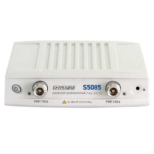 Анализатор цепей векторный Planar S5085 представляет собой 2-портовый прибор с динамическим диапазоном 135 дБ, работающий в полосе частот от 9 кГц до 8,5 ГГц и снабженный в качестве соединителей розетками типа N с волновым сопротивлением 50 Ом. Модель относится к линейке КОМПАКТ, отличаясь небольшими габаритами и весом, и работает под управлением ПК, подключаемого по USB каналу, для чего в комплект поставки включено ПО S2VNA. Изделие внесено в Госреестр СИ и может применяться для контроля качества продукции на производстве, при проведении сертификационных испытаний, аттестации радиоэлектронных устройств и систем, экспертиз и т.д.
