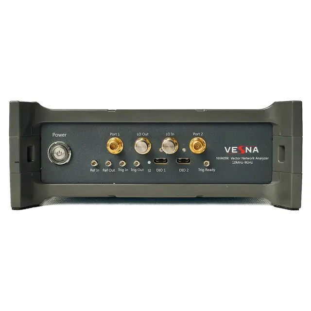 На передней панели изделия, помимо кнопки включения и 50-омных коннекторов SMA-2,92 мм измерительных каналов, размещены интерфейсы ввода-вывода сигналов запуска и опорной частоты, которые служат для синхронизации работы анализатора с другим лабораторным оборудованием. Также предусмотрены порты USB 3.0 Type C, задействуемые для обмена данными при использовании модуля VESNA NVA09K с другими аналогичными устройствами при реализации многопортовых расширений с каскадным подключением. С тыльной стороны корпуса размещается разъем подключения внешнего блока питания и коннектор USB Type-C для обмена данными с ПК. Для подключения к ПК прибор комплектуется специальным кабелем с соединителем, снабженным винтовыми фиксаторами, исключающими выпадение штекера из разъема.