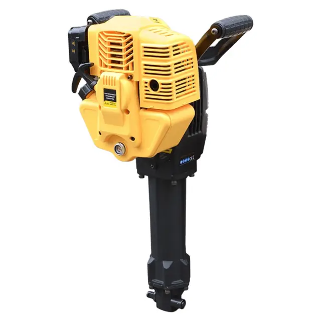 Бензоприводный отбойный молоток TSS-GJH95 благодаря простоте использования подходит как для профессионального, так и бытового применения. Он способен работать в широком диапазоне температур во взрывобезопасных средах и может использоваться круглый год. Полный контроль над инструментом в процессе эксплуатации обеспечивается за счет удержания агрегата двумя руками. Благодаря V-образному размещению рукояток, снабженных эластичным покрытием, минимизированы вибрационные воздействия на оператора. С целью снижения шумности мотор агрегата оборудован глушителем. Для приготовления топливно-масляной смеси в оптимальной пропорции в комплект поставки включена канистра из полупрозрачного пластика с соответствующей шкалой.