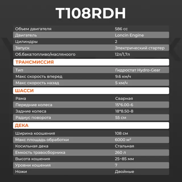 Садовый трактор YARD FOX OPTIMA T 108 RDH – старшая, наиболее производительная модель в линейке самоходных бензиновых газонокосилок, специально разработанная для профессионального ухода за газонами и травяными покрытиями на больших территориях, до 0,6 га. Рейдер, снабженный гидростатической трансмиссией Hydro-Gear и в качестве привода оборудованный 4-тактным карбюраторным двигателем мощностью 10,3 кВт с электрическим стартером, обеспечивает кошение в полосе шириной 108 см, со сбором обрезков травы в 260-литровый травосборник или мульчированием. Улучшенная эргономика агрегата и широкий набор встроенных средств автоматизации и безопасности упрощают выполнение работ и минимизируют их трудоемкость.