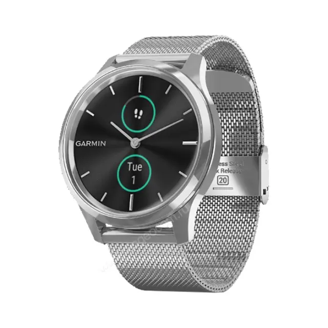 Наименование модели Garmin Vivomove Luxe полностью соответствует премиальному исполнению. Корпус из высококачественной стали с сапфировой линзой и металлический браслет "миланского" плетения с серебристым покрытием гармонично смотрятся и с деловым, и со спортивным костюмом, а также с ювелирными изделиями и бижутерией.