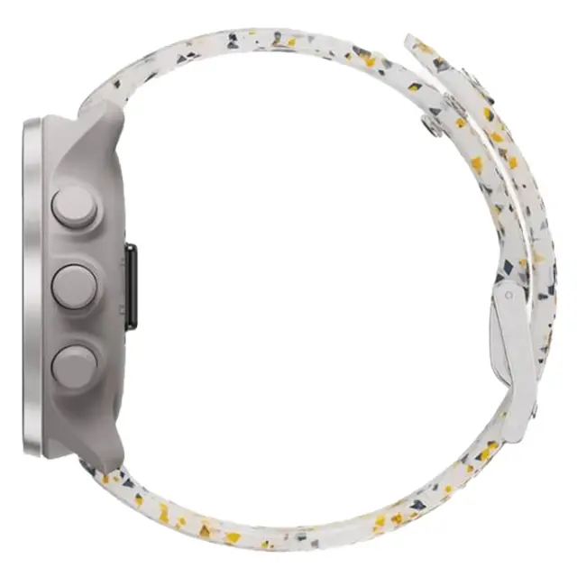 Новые часы SUUNTO 5 Peak Ridge Sand Multicolor поставляются с ремешком, который приятно носить, причем носить можно разными способами. Необычный пестрый ремешок изготавливается из излишков силикона, возникающих в процессе производства ремешков. Мы не выбрасываем эти излишки, а используем переработанный материал для изготовления стильных ремешков, которые сокращают вред для окружающей среды. Отлично выглядят, отлично работают.