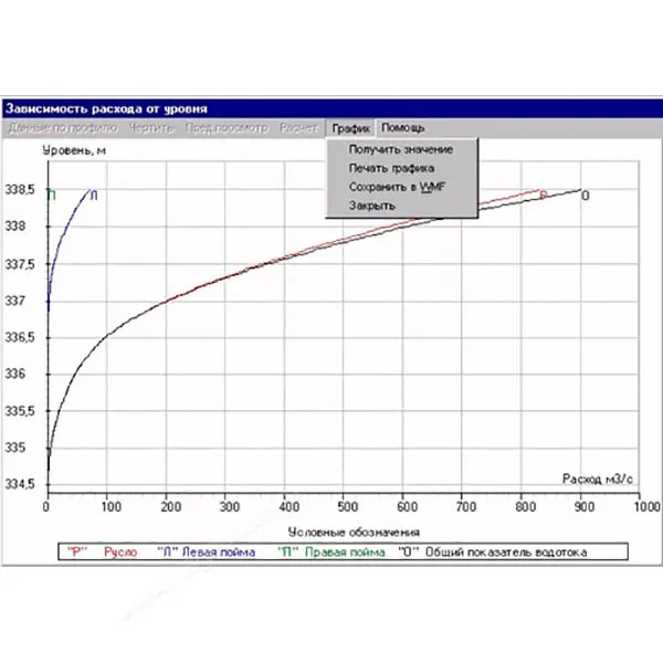 Программа решает как прямую задачу — определение расходов, средних скоростей течения воды и площадей живого сечения (по участкам и по морфоствору) для заданного расчетного уровня (рис. 1), так и обратную — определение расчетных уровней для заданных расходов воды.