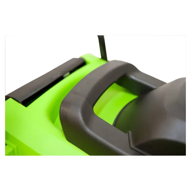 Для включения привода необходимо нажать пусковую кнопку, удерживая блокировочную скобу-рычаг на верхней ручке. Такая конструкция предотвращает непреднамеренный запуск агрегата, что минимизирует риск травматизма. Корпус газонокосилки Greenworks GLM1232 изготовлен из прочного пластика, не подверженного коррозии при высокой влажности, который можно мыть под водяной струей. Для удобства переноски в верхней части корпуса установлена транспортировочная рукоятка. За счет жесткой конструкции верхней части и наличия рамки-каркаса травосборник можно легко снимать одной рукой.