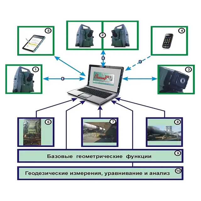 Программный комплекс "Визир 3D" имеет модульную структуру и выступает в качестве клиента и сервера для различных устройств. Верхняя часть схемы показывает аппаратную составляющую комплекса. Основой комплекса является работа с одним тахеометром, интерфейс осуществляется по радиосвязи, по технологии Bluetooth. Управляющая программа и электронный тахеометр обмениваются командами, данными и сообщениями. Для повышения точности измерений, когда ее невозможно добиться путем многократных повторений одиночным тахеометром, возможна работа с двумя тахеометрами в синхронном и асинхронном режимах. Для составления фотоабрисов измеренных точек комплекс "Визир 3D" может взаимодействовать с камерой. Кроме того, камера используется при визуальных обследованиях печей и сушилок для документирования прилегания роликов и бандажей, определения биения и зазоров шестерен и др.