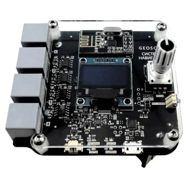 В нашей системе в роли маяков выступают ультразвуковые излучатели. Сигналы излучателей принимают два микрофона, расположенных на плате модуля навигации. Поскольку микрофоны установлены на плате сверху, излучатели всегда должны быть выше квадрокоптера, чтобы сигнал достигал микрофона. Чтобы определить свое местоположение, квадрокоптеру необходимо одновременно принять сигналы как минимум от трех маяков. Четвертый маяк повышает точность определения координат. Кроме того, при необходимости, любой из четырех маяков выступает в роли резервного, поддерживая работоспособность системы при отказе одного из маяков.