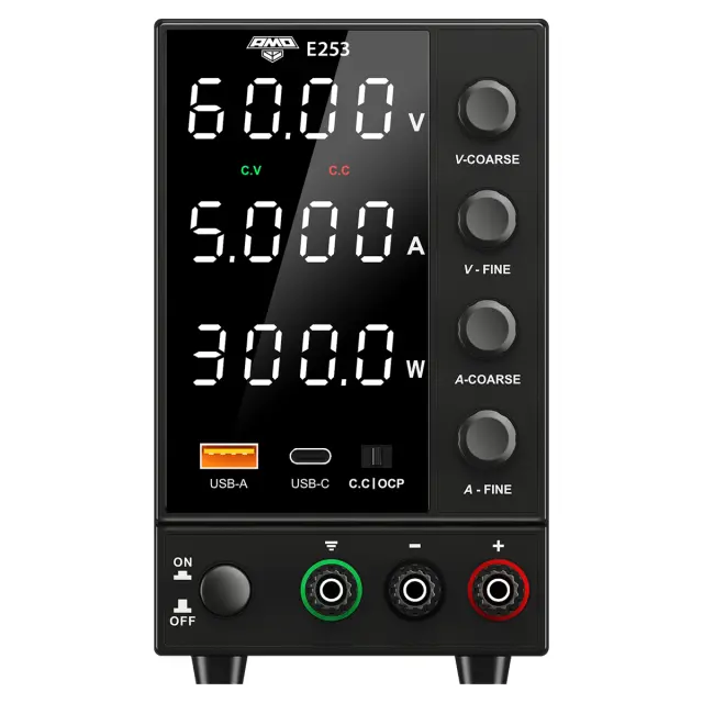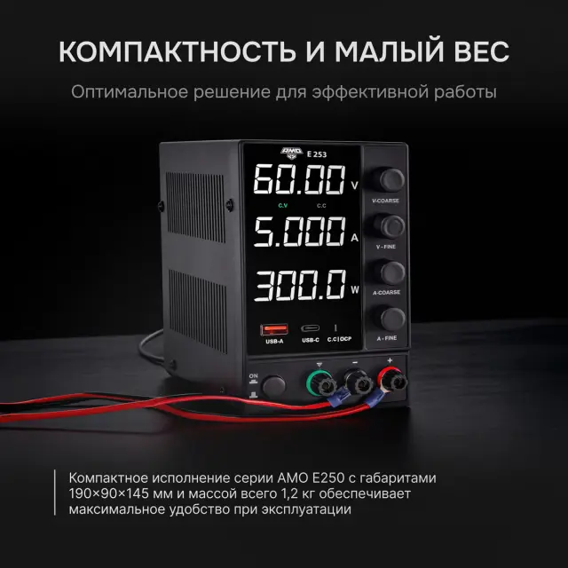 Источник питания AMO E253 — это профессиональное устройство с регулируемым выходом постоянного тока, разработанное для применения в промышленной автоматике, телекоммуникациях, сервисных центрах, учебных лабораториях и научно-исследовательских учреждениях. С диапазоном регулировки напряжения от 0,01 до 60 В и тока от 0,001 до 5 А, прибор обеспечивает максимальную выходную мощность 300 Вт, что позволяет стабильно питать широкий спектр оборудования — от промышленных датчиков и контроллеров до систем видеонаблюдения и радиоэлектронных плат.