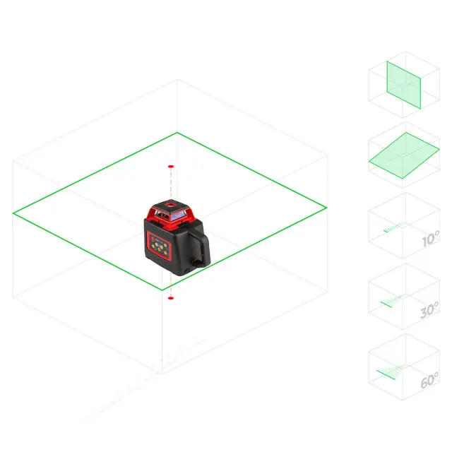 Самонивелирование лазерного луча в диапазоне ± 5° происходит при помощи сервопривода, причем выравнивание обеспечивается как при горизонтальной установке, так и при вертикальной. Отключив его вы можете строить наклонные линии.