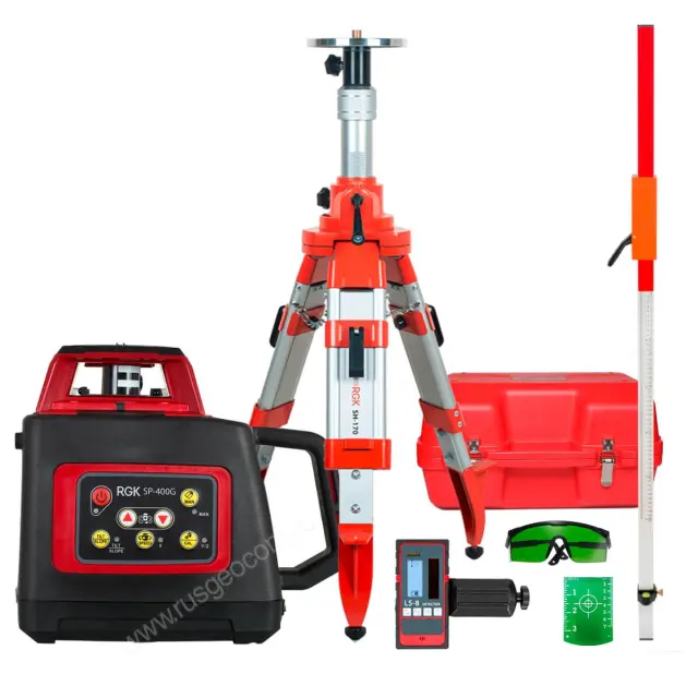 Радиус действия лазера ротационного нивелира RGK SP-400G при работе с приемником составляет диаметр до 400 метров, а точность построения ± 1 мм на 10 метров. Это позволяет использовать лазерный уровень на крупных стройплощадках в качестве замены оптическому нивелиру.