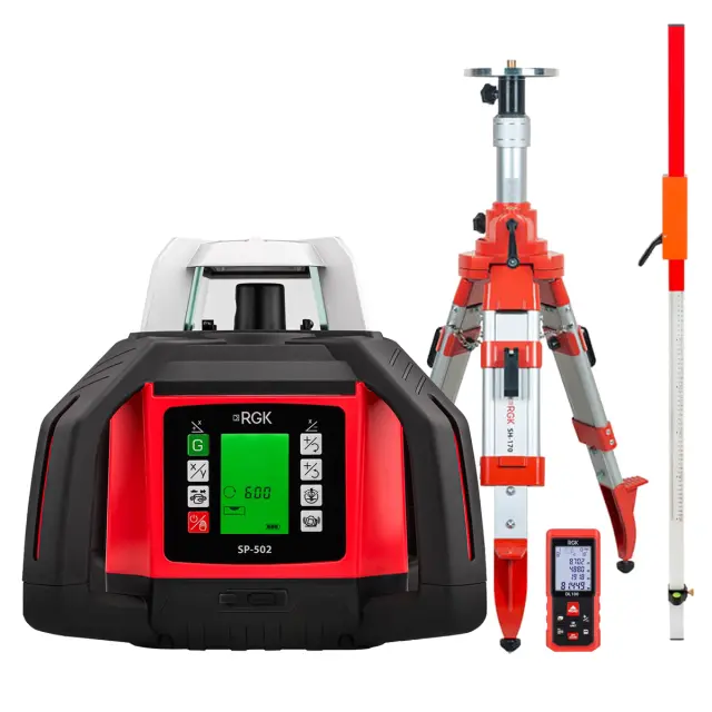 Отзывы о Комплект: ротационный нивелир RGK SP-502 с калибровкой + элевационный штатив RGK SH-170 + рейка RGK LR-2 + дальномер RGK DL100