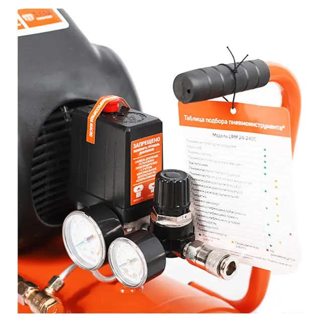 - Прессостат автоматически отключает двигатель при давлении в ресивере 8 бар, что продлевает срок службы.