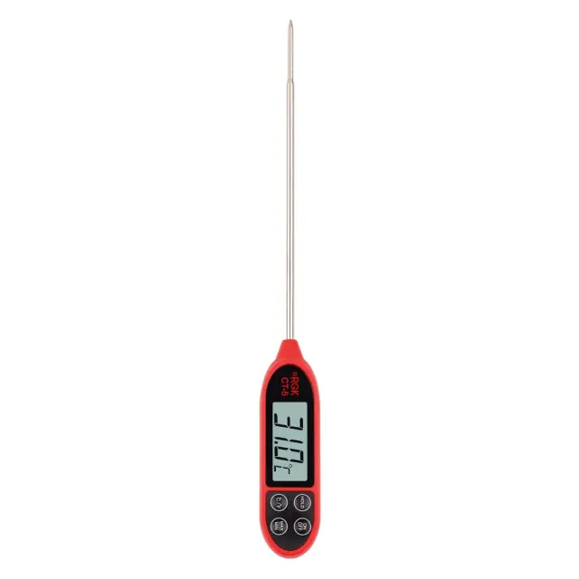 Измерительный сенсор кулинарного термометра RGK CT-5 расположен на конце стального стержня длиной 145 мм, что делает более безопасной работу с горячими объектами. Диаметр наконечника составляет 3 мм, поэтому проверки не нарушают товарный вид продукции. Датчик в металлическом корпусе водонепроницаем, что дает возможность, например, замерять температуру напитков, технических жидкостей или теплоносителя.