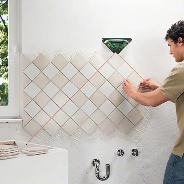 При необходимости, в ходе выполнения работ лазерный уровень Bosch PLT 2 можно использовать как обычный угольник. Удобно размещать проецирующий прибор при укладке первого ряда плитки у стен позволяет один острый угол. Для облегчения разметки и повышения точности на элементах корпуса нанесены риски, соответствующие положению лазерных линий. На диагональной грани дополнительно нанесены штрихи с шагом 5°, по которым можно осуществлять базовую угловую разметку, а также производить оценочное измерение углов.