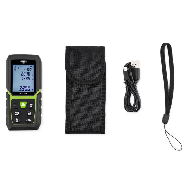 Лазерный дальномер AMO DIST 50G с рабочим диапазоном до 50 м, снабженный встроенным инклинометром, способен выполнять измерение расстояний и углов, вычисление площадей, объемов, недоступных размеров, а также прочих косвенных и производных параметров. Инструмент защищен от пыли и брызг в соответствии с требованиями IEC 60529 по категории IP54 и подходит для использования как в помещениях, так и на открытом воздухе. Измерения могут выполняться с руки или со штатива – когда необходимо обеспечить предельную точность на больших дистанциях, для чего с обратной стороны корпуса предусмотрено соответствующее крепление с внутренней резьбой.