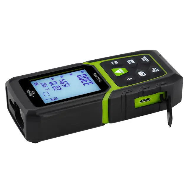 Для лучшей заметности двухслойный корпус выполнен в контрастной салатово-черной расцветке, за счет чего минимизирован риск случайной утери инструмента. Для предотвращения выскальзывания прибора из руки в процессе работы предусмотрена возможность его крепления на запястном ремешке, включенном в комплект поставки. Питание лазерной рулетки производится от встроенного литиевого аккумулятора, емкости которого в 850 мА ч достаточно для выполнения до 8000 замеров без подзарядки. Для экономии заряда реализованы функции автоотключения лазера и всего измерителя при длительном бездействии. За счет отсутствия необходимости регулярной покупки батареек изделие характеризуется низкой эксплуатационной стоимостью.