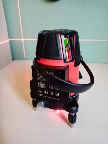 Может работать вообще без аккумулятора - только от сети! При этом, кроме аккума, его можно запитывать и обычными пальчиковыми батарейками. Свободно вращается вокруг своей оси, даже при работе со штатива или штанги. Есть лазерная точка отвеса на пол. На линиях есть отдельные точки, которые значительно ярче остального луча. Видимость лучей для домашней отделки оптимальная. Можно заблокировать компенсатор, не выключая прибор.