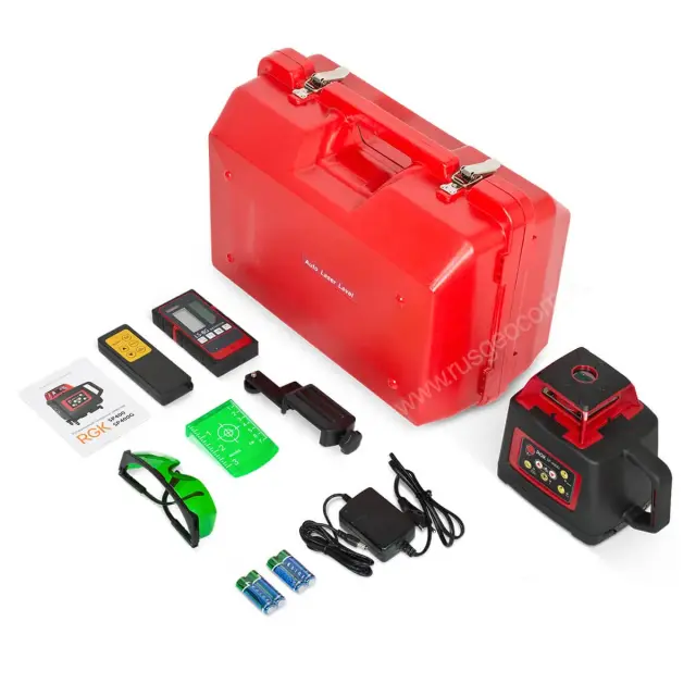 Удобный, компактный корпус с одной ручкой. Есть 2 лазерные точки отвеса вниз и наверх. При работе с приемником достает как минимум до 200 метров. В комплекте есть напольная подставка с бесконечным вращением. Корпус полностью защищен резиновым покрытием. Можно контролировать скорость вращения. С пульта принимает сигнал от пульта до 30 метров.