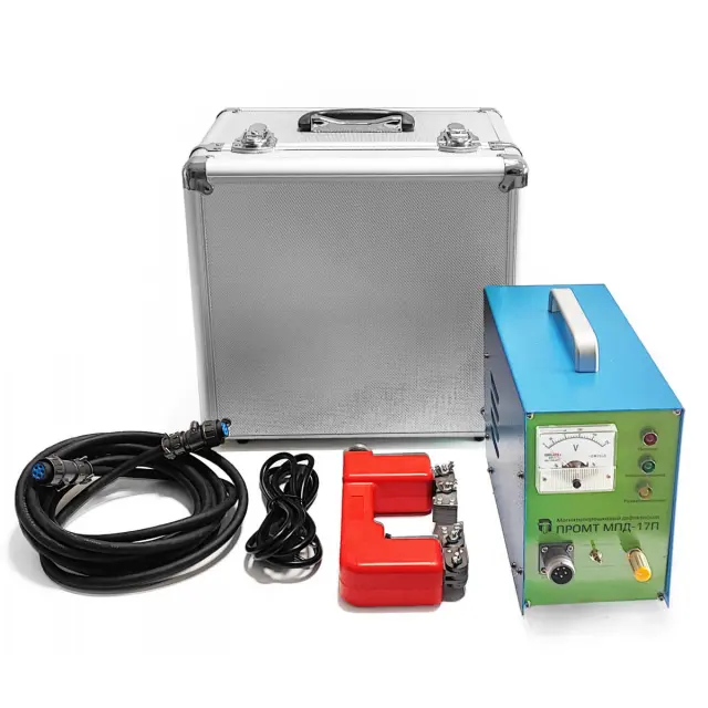 Это простой в применении и надежный прибор, представляющий из себя блок управления и подключаемые к нему электромагниты различных типов, включая соленоид для контроля радиусных объектов. Электромагниты состоят из корпуса с катушкой, контактных полюсов (тип "Д", "А" и "Е"), кнопки и разъема подключения кабеля. Включение электромагнита выполняется нажатием кнопки на его корпусе, соединение с блоком управления - кабелем, подключаемым к разъему. Для намагничивания и размагничивания детали достаточно 4-х секунд. Поставляется в металлическом кейсе с отделениями для магнитов, блока и кабелей.