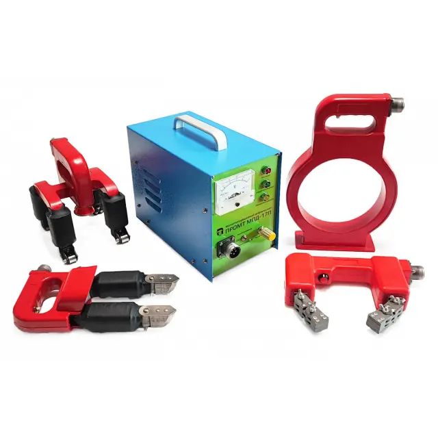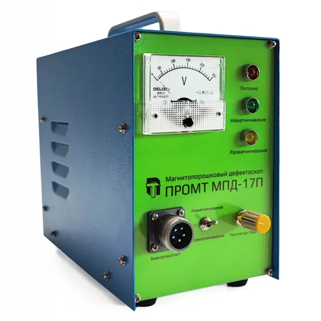 Магнитопорошковый дефектоскоп ПРОМТ МПД-17П предназначен для намагничивания ферромагнитных объектов приложенным магнитным полем переменного тока и дальнейшего размагничивания убывающим магнитным полем при проведении магнитопорошкового контроля по ГОСТ 53700-2009, ГОСТ 56512-2015, ГОСТ ISO 17638-2018 и ГОСТ Р ИСО 9934-1-2011. В основе метода лежит визуальный контроль рисунка созданного ферромагнитными частицами на поверхности намагниченного изделия. Такой рисунок позволяет выявлять мельчайшие поверхностные и подповерхностные дефекты, так как в местах их расположения магнитное поле искривляется, что приводит к скапливанию частиц на этих участках. Намагничивание происходит путем установки выбранного электромагнита подключенного к блоку управления на контролируемую деталь. Благодаря выбору электромагнитов различного типа дефектоскоп позволяет проводить контроль практических любых по форме объектов, включая трубы и лопатки. Блок управления имеет регулировку тока намагничивания в широком диапазоне, есть функция быстрого размагничивания. Является модифицированной версией устройства NOVOTEST МПД-17П.