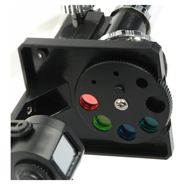 В четыре отверстия установлены цветные светофильтры – голубой, синий, зеленый и красный. Они пригодятся при наблюдении светлых и прозрачных малоконтрастных объектов. Добавляя нужный цвет можно увеличить контрастность изображений и сделать их более отчетливыми. Диск с отверстиями и светофильтрами расположен снизу предметного столика и имеет фиксатор устанавливаемых положений.
