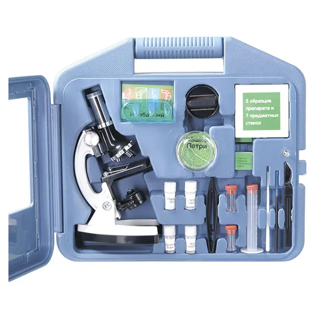 - Расширенный комплект с минилабораторией в кейсе и подробное Руководство делают микроскоп отличным подарком.