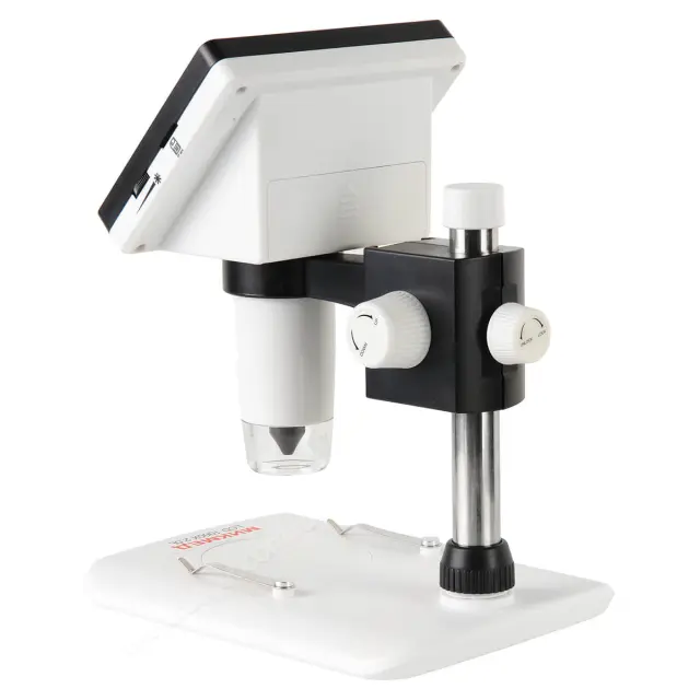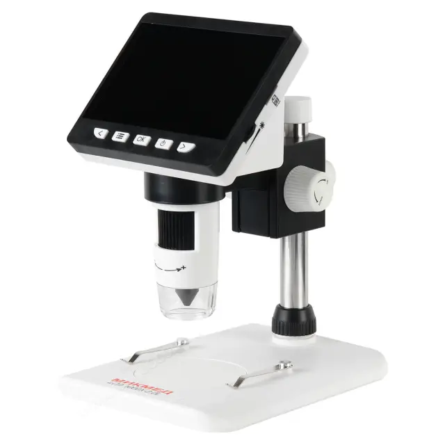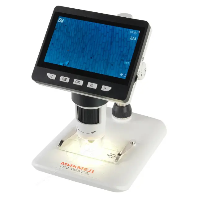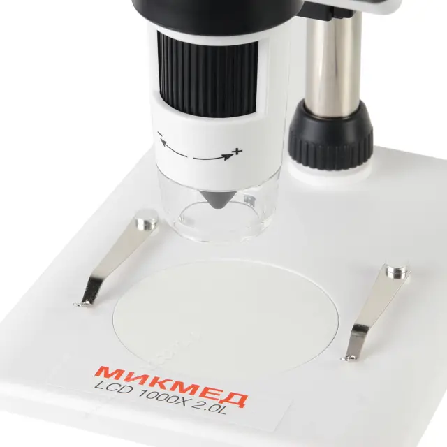Микроскоп Микромед оборудуется 2-мегапиксельной камерой. Плоское основание штатива, верхняя поверхность которого выполняет роль неподвижного предметного столика, позволяет комфортно размещать на нем объекты крупного размера, например, электронные платы при выполнении визуальной диагностики и ремонта с заменой SMD-компонентов. При этом камера с дисплеем может быть развернута относительно вертикальной оси микроскопа МИКМЕД LCD 1000Х 2.0L в любую сторону. Для неподвижного крепления образцов и микропрепаратов на предметных стеклах стандартного размера столик оборудован подпружиненными фиксаторами.