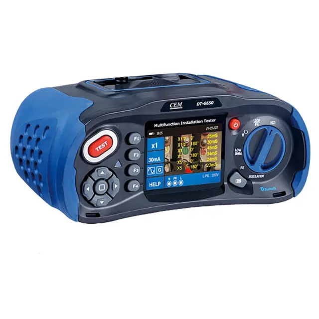 Тестер CEM DT-6650 фиксирует показатель переменного сетевого напряжения и его частоту между фазами, фазным и нулевым либо защитным проводниками, проверяет УЗО разных типов с заданием различных токовых режимов. Электронная блокировка исключает повреждение измерителя при неправильном подключении.
