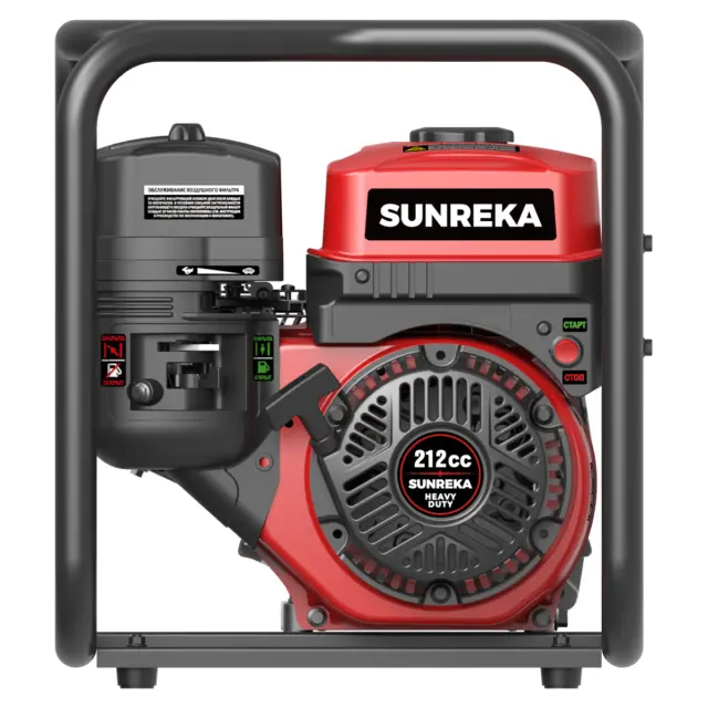 Все узлы SUNREKA GWP50ST смонтированы на прочной стальной сварной раме. Рама не только облегчает транспортировку и установку помпы на неровном грунте, но и служит надежным защитным каркасом, предотвращающим повреждение двигателя и улитки насоса в жестких условиях стройплощадки или полевых работ. Оптимальный баланс веса и габаритов делает эту модель удобной для перемещения силами одного оператора.