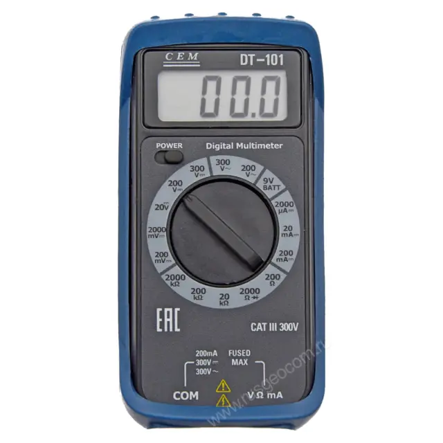 DT-101 представляет собой компактный аппарат, предназначенный для измерения напряжения переменного и постоянного тока. Кроме того, мультиметр DT-101 позволяет проводить прозвон электроцепей, тестировать диоды, измерять сопротивление изоляции кабелей и проводов различного назначения, а также проверять батареи на работоспособность.
