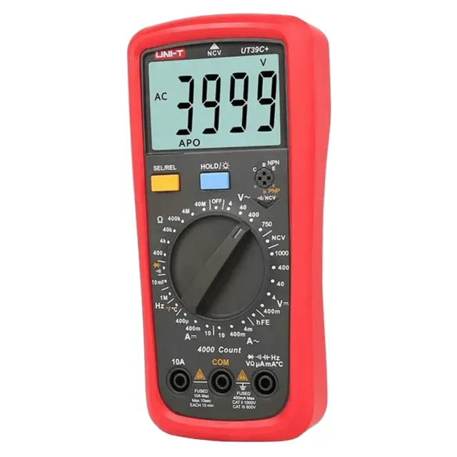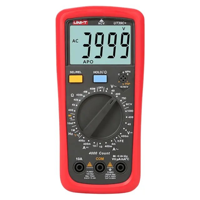 Для обеспечения безопасности и точности измерений мультиметр UNI-T UT39C снабжен комбинированным контуром, защищенным от перегрузок плавким предохранителем, и отдельным входом для контроля силы тока большого номинала. Дополнительные слоты для регистрации параметров транзисторов и емкости конденсаторов повышают точность определения характеристик электронных компонентов, позволяя исключить из схемы замеров соединительные провода, которые вносят дополнительную погрешность в получаемые результаты.
