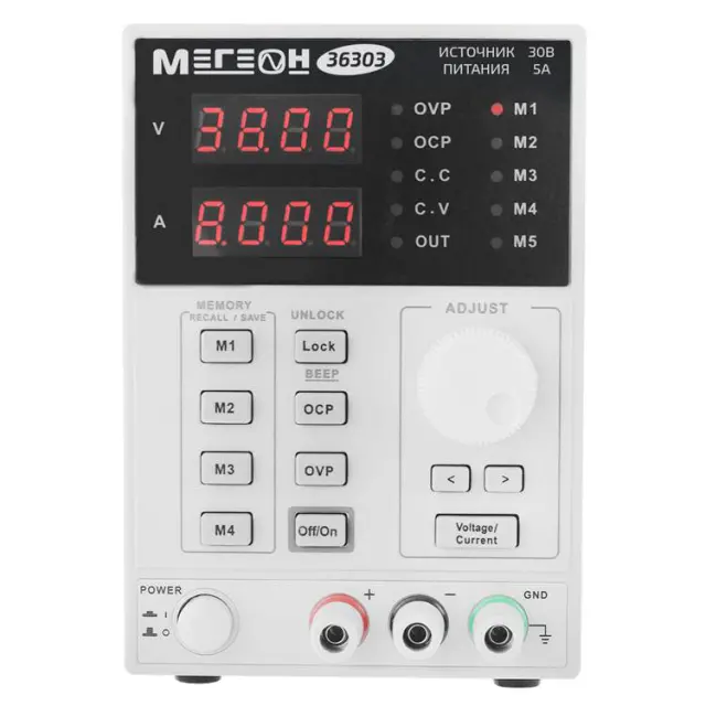 Показатели силы тока и напряжения на выходе МЕГЕОН 36303 могут задаваться с разрешением 0,001 А и 0,01 В соответственно путем прямого регулирования или вызова из памяти предварительно настроенных значений. Ввод цифровых показателей выполняется верньером ADJUST с переключением между разрядами с помощью соответствующих клавиш, что ускоряет программирование. Вызов настроек из памяти для четырех ячеек производится прямым нажатием кнопок, а режим M5 активируется поворотом энкодера после включения клавиши M4.