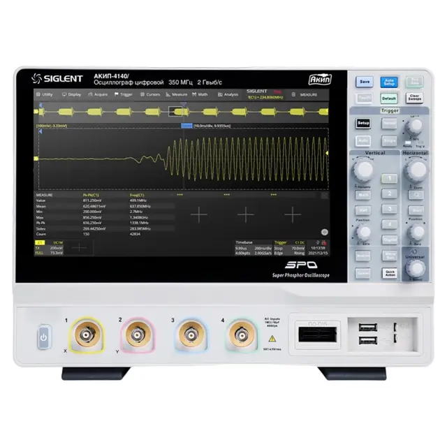Осциллограф АКИП-4140/4 является старшей модификацией в линейке высокопроизводительных приборов HD класса, с 10,1-дюймовым сенсорным дисплеем, которая отличается от других моделей своей серии наибольшей полосой пропускания. Устройство снабжено 4 аналоговыми каналами, а при доукомплектовании логическим 16-канальным пробником и активации соответствующей программной опции – также может работать со смешанными сигналами. Низкий уровень собственных шумов, поддержка технологии Super Phosphor Oscilloscope и наличие широкого набора штатных и опциональных инструментов для измерений и анализа делают данное устройство оптимальным выбором для разработки и отладки систем питания, медицинского оборудования, высокоточных датчиков, разнотипных прецизионных приводов и т.п.