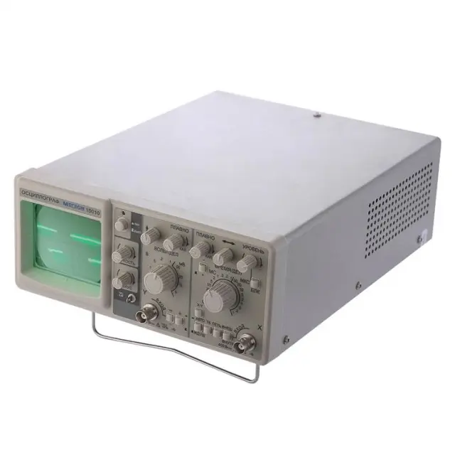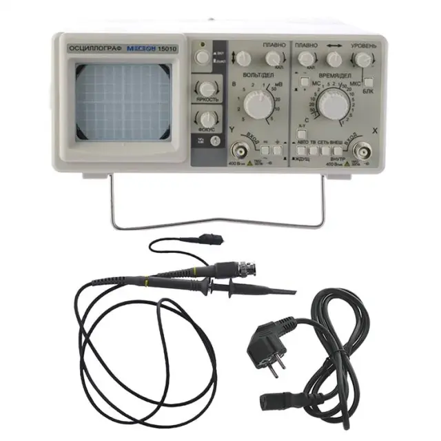 Осциллограф аналоговый МЕГЕОН 15010 представляет собой одноканальный радиоизмерительный прибор бюджетного класса на основе ЭЛТ с высоким рабочим ресурсом. Простой и надежный, он обладает базовым перечнем функций, и может использоваться в сервисных службах и на производстве, обеспечивая выполнение рутинных проверочно-диагностических операций, а также для обучения и радиолюбительских нужд. Основным отличием от модели 15011, с такими же техническими характеристиками и перечнем функций, является горизонтальное исполнение корпуса, что позволяет легко монтировать оборудование в приборную стойку, а при настольном использовании – устанавливать несколько приборов такого же форм-фактора друг на друга, добиваясь компактности размещения.