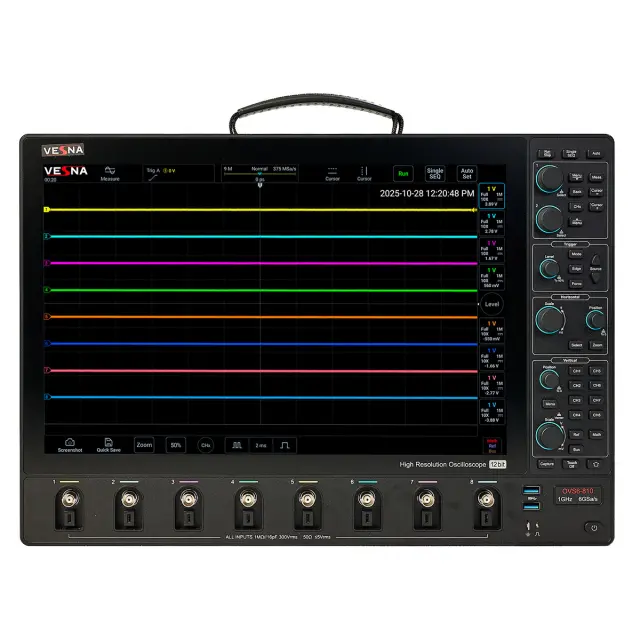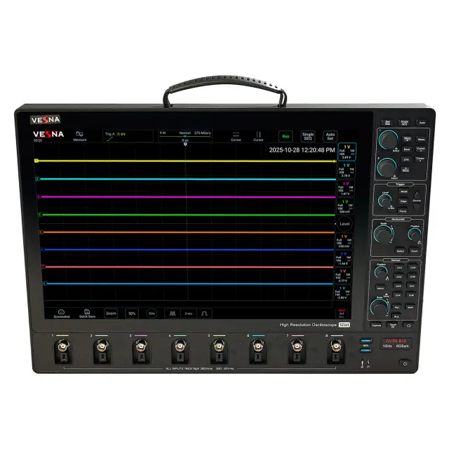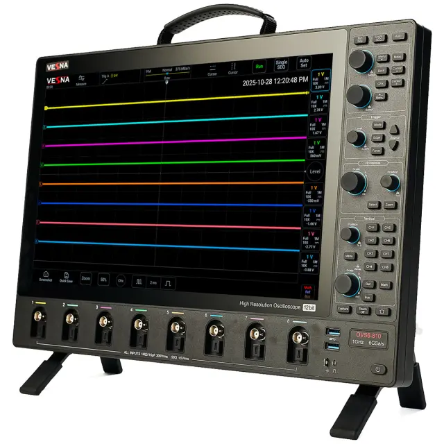 При полосе 500 МГц VESNA OVS6-805 остается более доступным, чем гигагерцовые модели, но сохраняет ключевые преимущества линейки OVS6: 12-битный АЦП, высокую скорость обновления и глубокую память. Это делает его оптимальным выбором для инженерных центров, сервисных лабораторий и учебных заведений, где важны и функциональность, и экономическая эффективность.