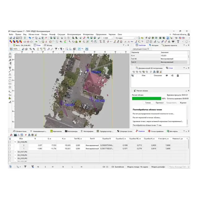 В ТИМ КРЕДО ФОТОГРАММЕТРИЯ реализована возможность поэтапного расчета: первый этап завершается уравниванием и позволяет визуально оценить качество полученной модели посредством "редкого облака точек". Это позволяет своевременно устранить ошибки или уточнить параметры, не тратя время на продолжительные по времени этапы формирования плотного облака. В результате уравнивания вычисляются невязки опорных точек. Значения невязок отображаются в таблице Опорные точки, графически на плане и в 3D. Дополнительно в соответствующей таблице отображаются пиксельные невязки связующих точек. Таблица позволяет локализовать точки и фотографии с наибольшими значениями невязок и быстро перейти к соответствующей связующей точке на фотоснимке.