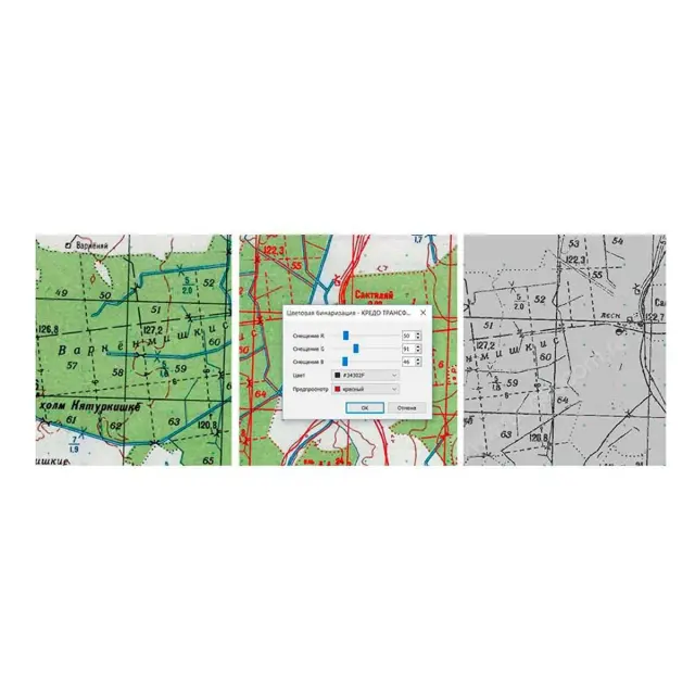 - выполнение цветоделения – извлечение пикселей заданного цвета с порогом в черно-белое растровое изображение;