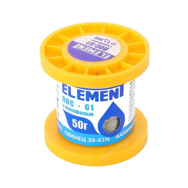 Технические характеристики Припой ELEMENT ПОС 61 (0,5мм;50гр. с канифолью)