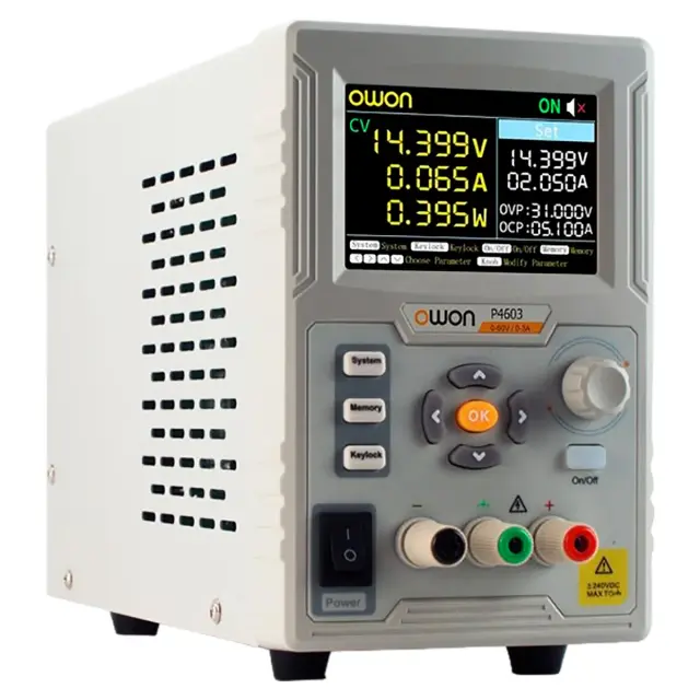 Программируемый источник питания OWON P4603 представляет собой одноканальное лабораторное устройство с максимальной выходной мощностью 180 Вт, с регулируемым рабочим напряжением от 0 до 60 В. Изделие оснащено встроенными средствами измерений, которые обеспечивают точное определение показаний напряжения, силы тока и выдаваемой мощности на выходе, что исключает необходимость задействования отдельного высокоточного вольтметра и амперметра.