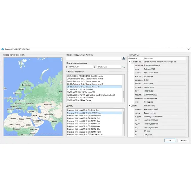 В ТИМ КРЕДО 3D СКАН доступна настройка параметров классификатора топографических объектов, выбор системы координат, выбор варианта отображения объектов на плоскости и единиц измерения. Есть возможность импортировать системы координат из базы данных EPSG, для удобства поиска объектов в базе реализован графический интерфейс.