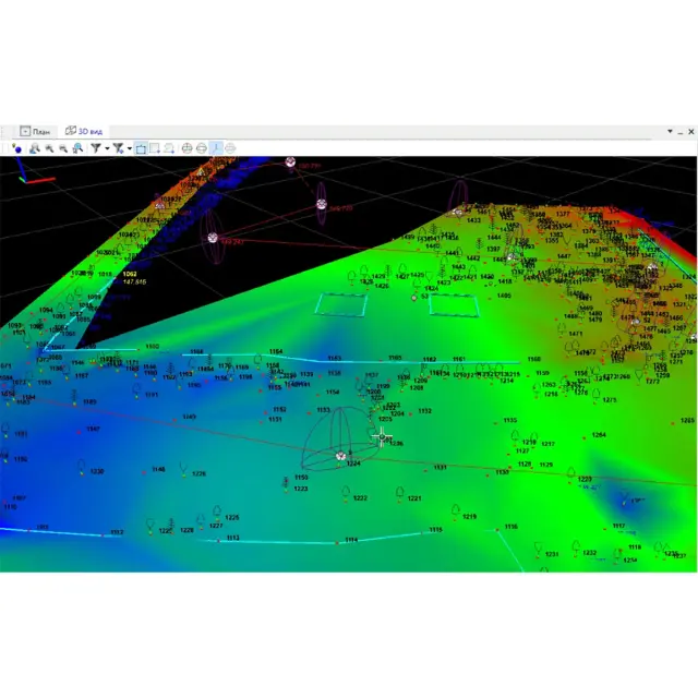 В подсистеме, по результатам выполненной съемки, есть возможность построения поверхности и отображения ее при помощи горизонталей и градиентной заливки, формирование точечных, линейных и площадных топографических объектов.