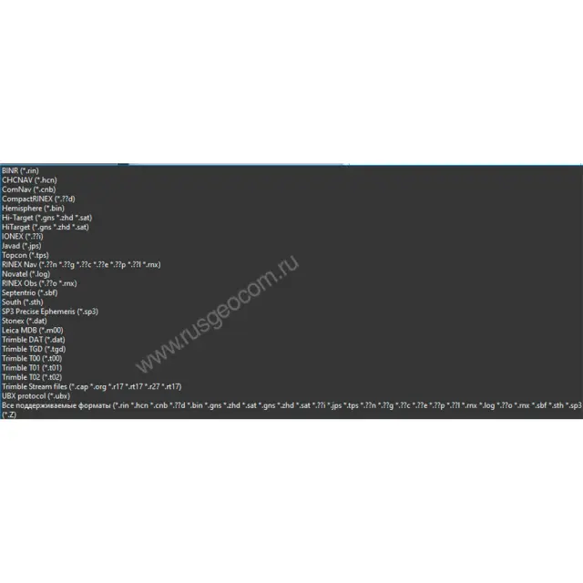 - Trimble — *.dat, *.tgd, *.t00, *.t01, *.t02, потоковые форматы *.cap, *.org, *.r17, *rt17, *.r27, *.rt27,