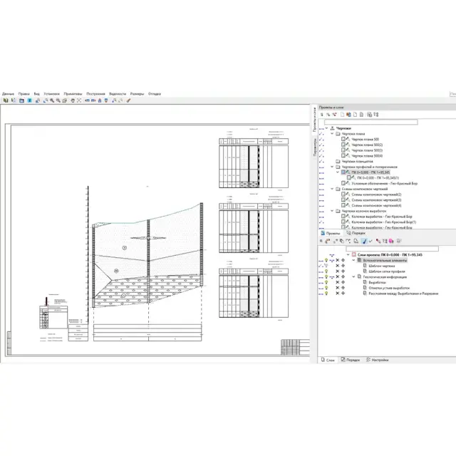 На основании данных сформированных пространственных моделей, пользователь может выпустить произвольное количество чертежей плана, профиля и геологических колонок. Оформление выходных графических материалов осуществляется с помощью шаблонов, которые можно настроить в соответствии с требованиями конкретной организации.