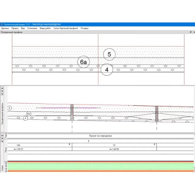 В простых ситуациях профили СЛ можно определить непосредственно при построениях в плане, задав необходимые отметки в узлах (по умолчанию они интерполируются из точек и поверхностей). При решении более сложных задач, например, моделирование вертикальных поверхностей (подпорных стенок и т.п.), можно перейти в окно профилей. Это позволит просматривать разрезы, пересечки и развернутый план СЛ и использовать широкие возможности создания и редактирования линий профилей.