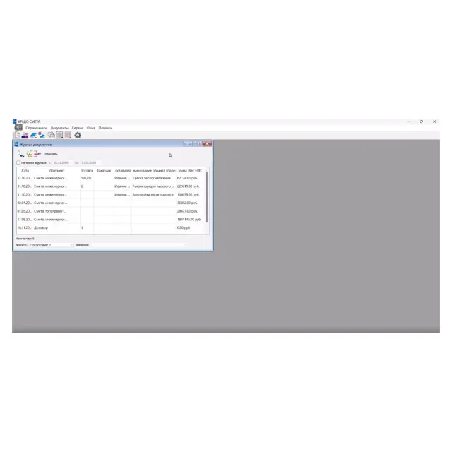 Сортировка и фильтрация смет по различным критериям: дата, заказчик, исполнитель (сметчик), договор.