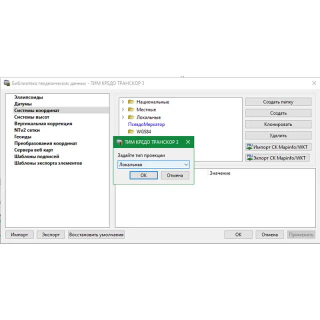 Программная система ТИМ КРЕДО ТРАНСКОР является подсистемой Программной системы ТИМ КРЕДО (Технологии Информационного Моделирования КРЕДО), которая обеспечивает доступ к следующей функциональности: преобразования геоцентрических, геодезических и прямоугольных плоских координат по известным параметрам связи, для установления (уточнения) параметров связи различных систем координат и ключей местных систем координат, расчета высотной коррекции (калибровке по высоте) и формирования пользовательских моделей геоида.