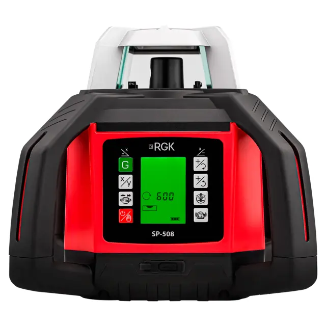 Управление ротационником RGK SP-508 максимально упрощено благодаря беспроводному пульту с дисплеем, работающему на расстоянии до 80-100 метров. Оператор может включать/выключать вращение, переключать режимы, регулировать скорость сканирования или активировать автоориентацию не подходя к самому прибору. Это особенно ценно при работе в одиночку или в условиях, где доступ к нивелиру затруднен (например, в котловане или на высоте).