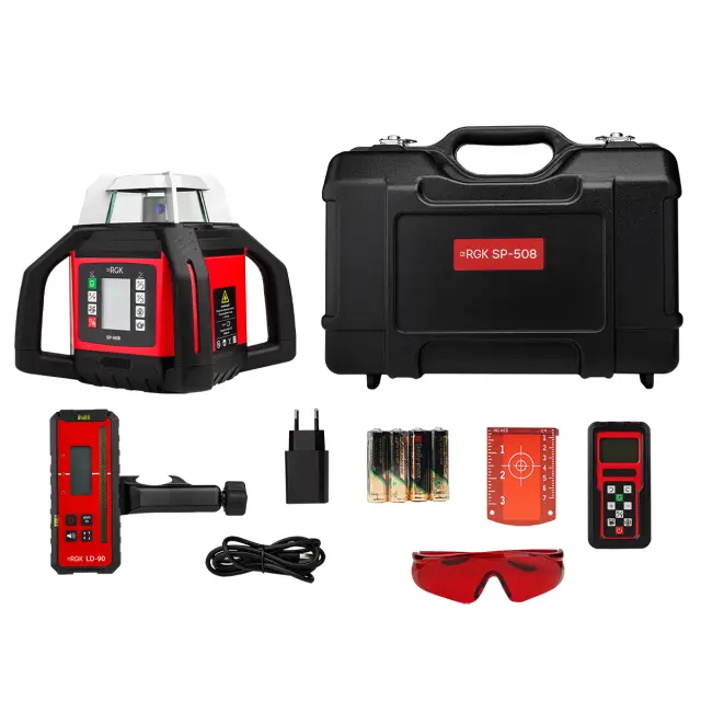 Ротационный нивелир RGK SP-508 — это усовершенствованная версия популярной модели SP-502, сохраняющая все её ключевые преимущества и при этом предлагающая одну принципиально новую функцию — автоматическую ориентацию лазерного луча на приёмник. Эта технология значительно упрощает и ускоряет ряд геодезических и строительных операций, где требуется точное совмещение лазерной плоскости с заданной отметкой. Она не просто упрощает работу, а кардинально меняет подход к выполнению ряда задач: теперь не нужно вручную подстраивать прибор под приёмник — он делает это сам, мгновенно и точно.